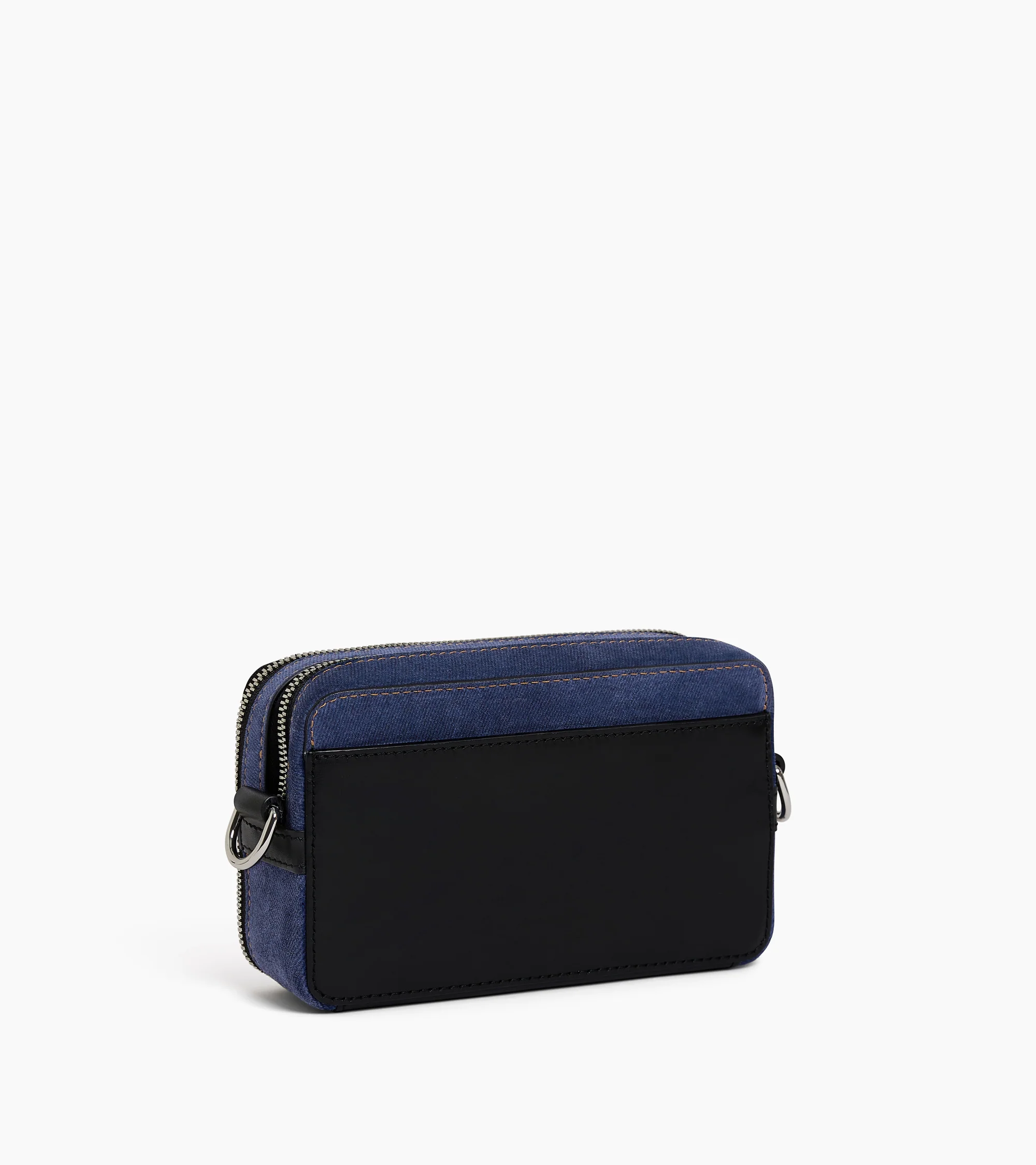Small denim-effect leather pouch with tone-on-tone Le Tanneur branding and an adjustable, detachable shoulder strap. Le Tanneur branding and silver finish metallic elements.