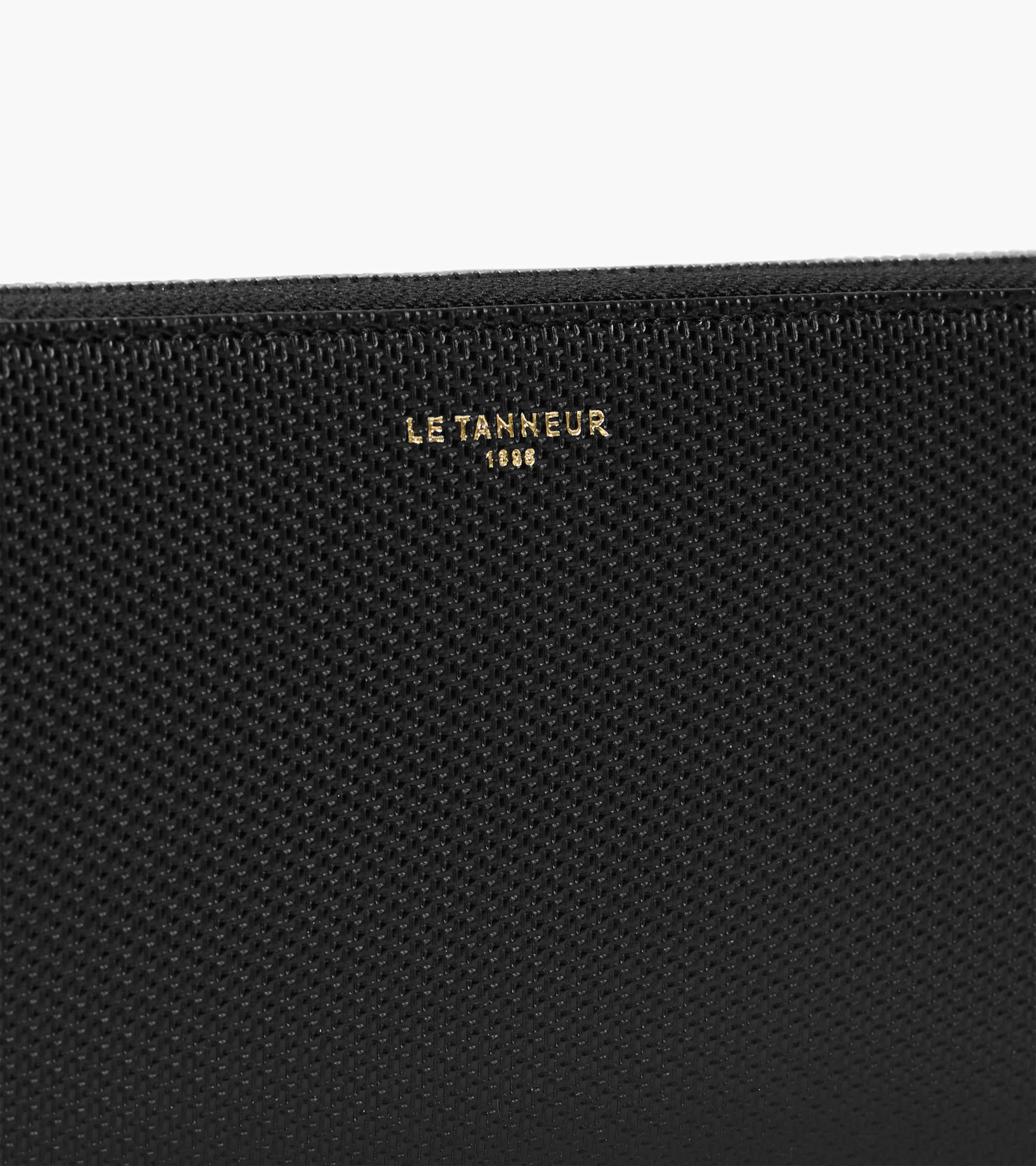 Zipped travel companion with Le Tanneur branding on pale gold film. Anti-RFID security.