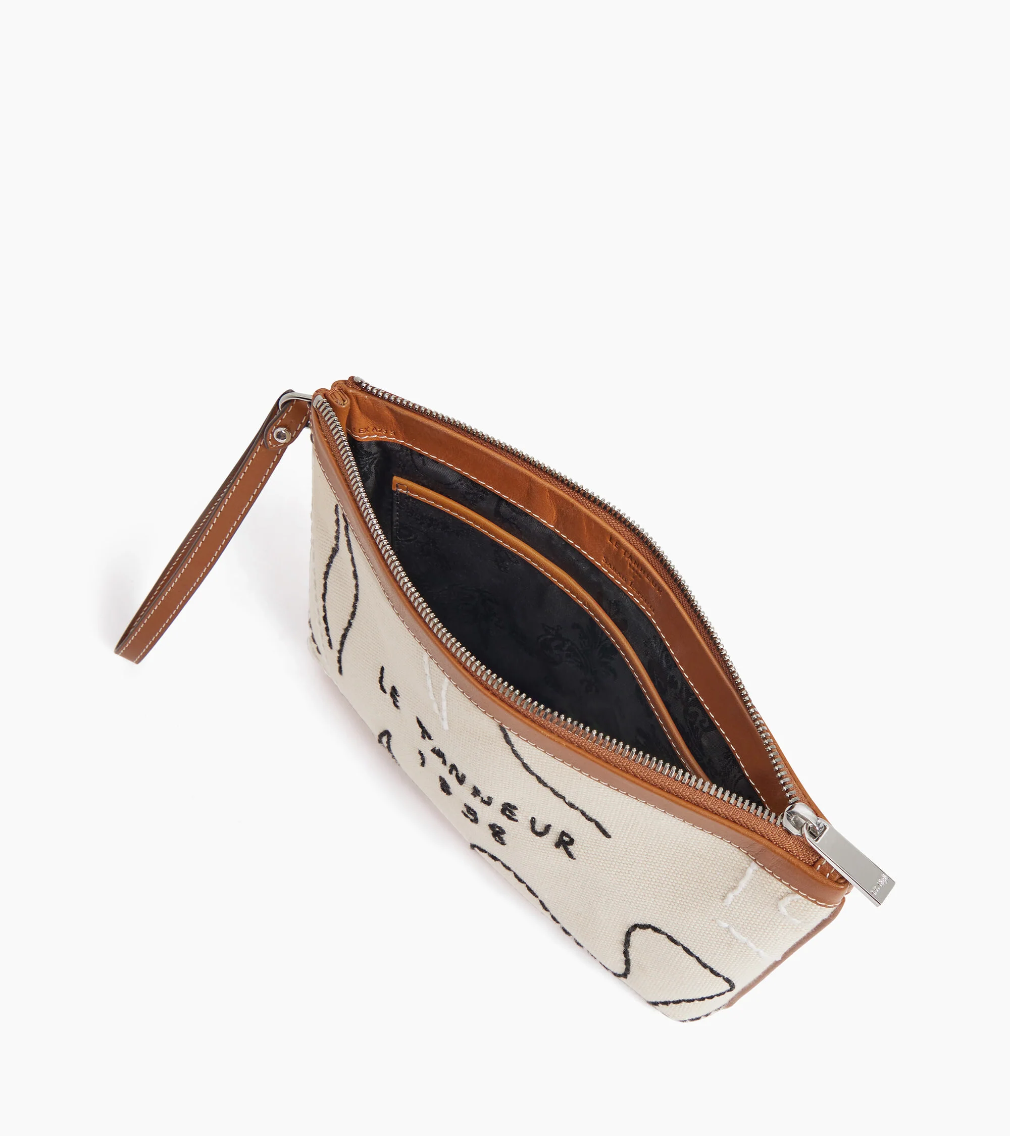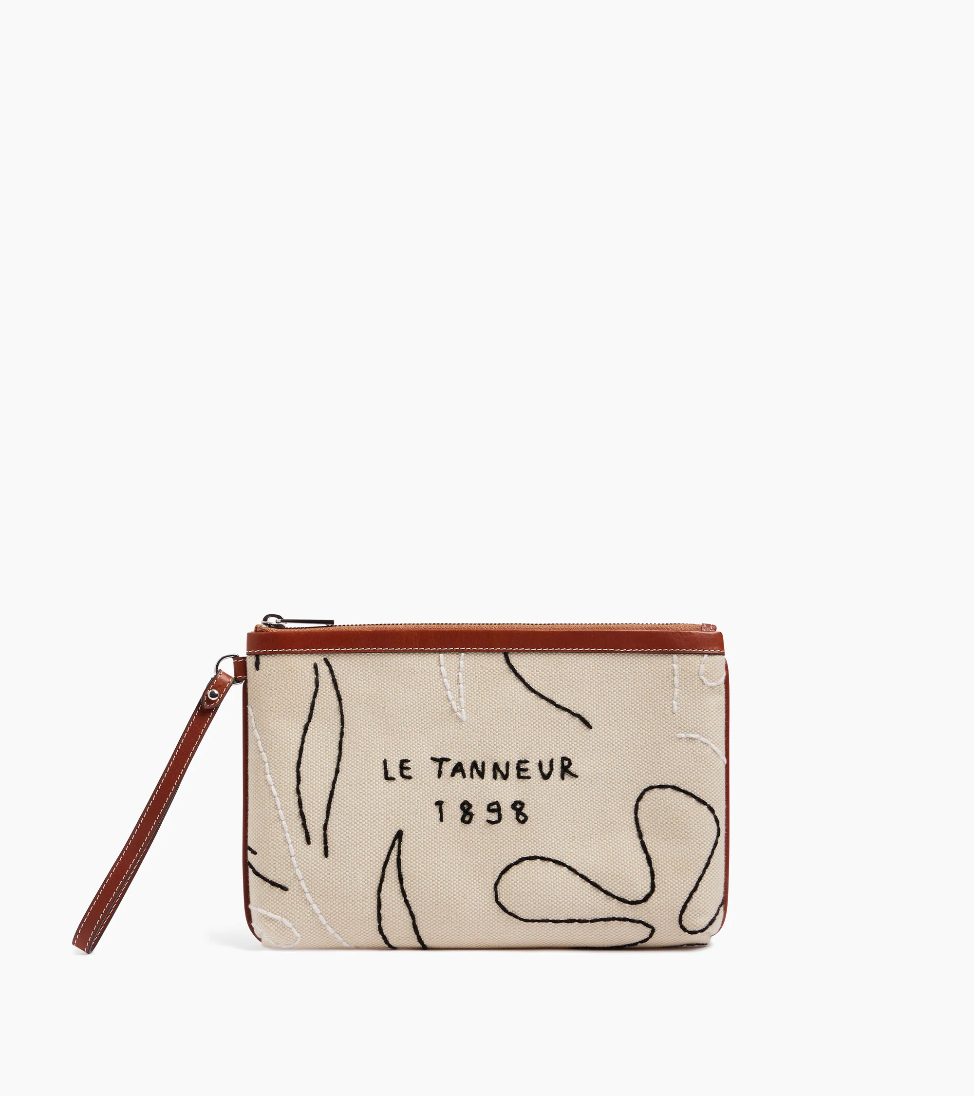 Le Tanneur x Sarah Espeute embroidered clutch bag with wrist strap and silver-finish metal hardware.